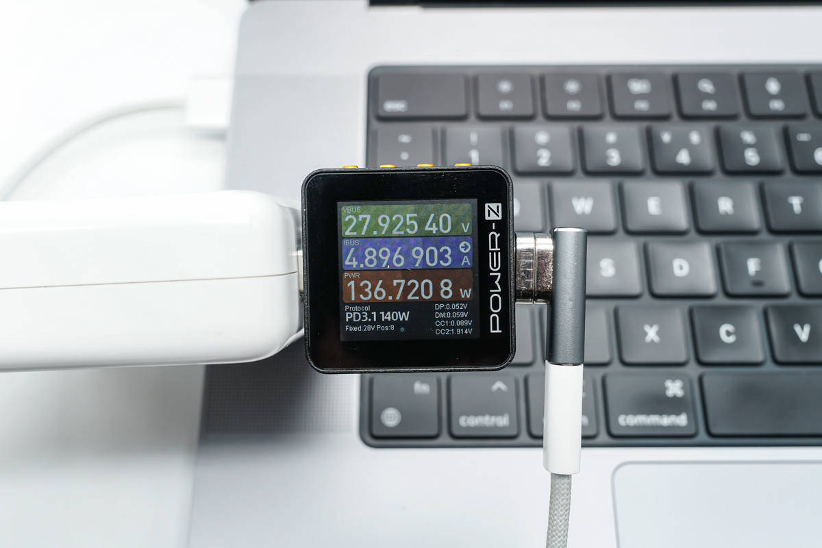 Anche... supporta anche la ricarica rapida da 140 W e l'adattatore è collegato al caricabatterie al nitruro di gallio da 140 W di Apple e al cavo di ricarica rapida MagSafe 3. In questo momento, la tensione di carica è di 28 V e la potenza è di 135,72 W.