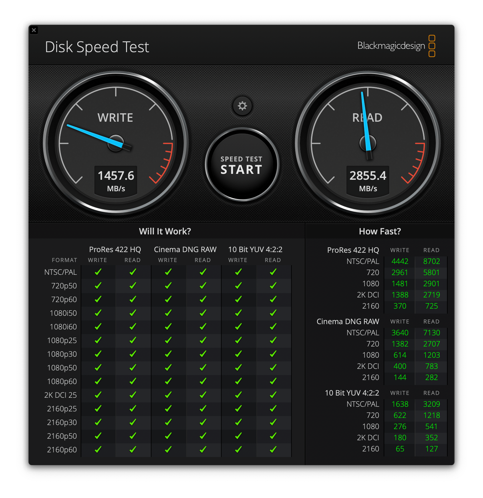 Utilizzando il Disk Speed Test su MacBook Pro per testare la velocità di trasferimento, la velocità di scrittura misurata è 1457,6 MB/s e la velocità di lettura è 2855,4 MB/s. (La velocità di scrittura effettiva del disco rigido Samsung X5 qui è 1700 MB/s e la velocità di lettura è 2400 MB/s)